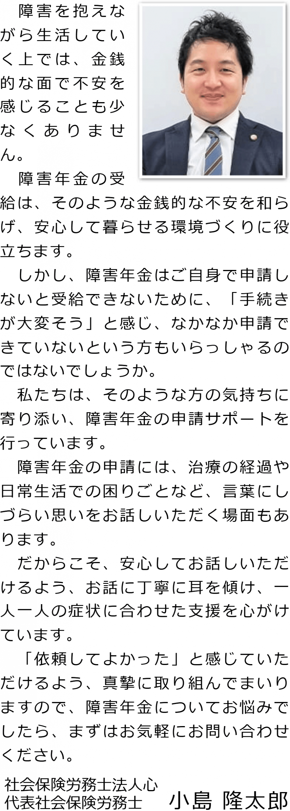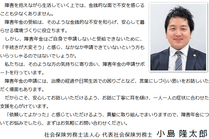 トップその他代表メッセージ 階層構造▼ その他(目次) 代表メッセージ その他(目次)その他トップ共通バナー※消さない障害年金無料診断サービス初めて障害年金を申請の方へ手続きの流れ代表メッセージ電話・テレビ電話相談について電話・テレビ電話相談の流れ心グループニュース(新着情報)お客様相談室費用の安さにこだわる理由関連リンクプライバシーポリシー 受付時間 平日 9時~21時、土日祝 9時~18時 夜間・土日祝の相談も対応します (要予約) 所在地 〒330-0846 埼玉県さいたま市大宮区大門町1-63栗橋ビル6F 0120-25-2403 お問合せ・アクセス・地図